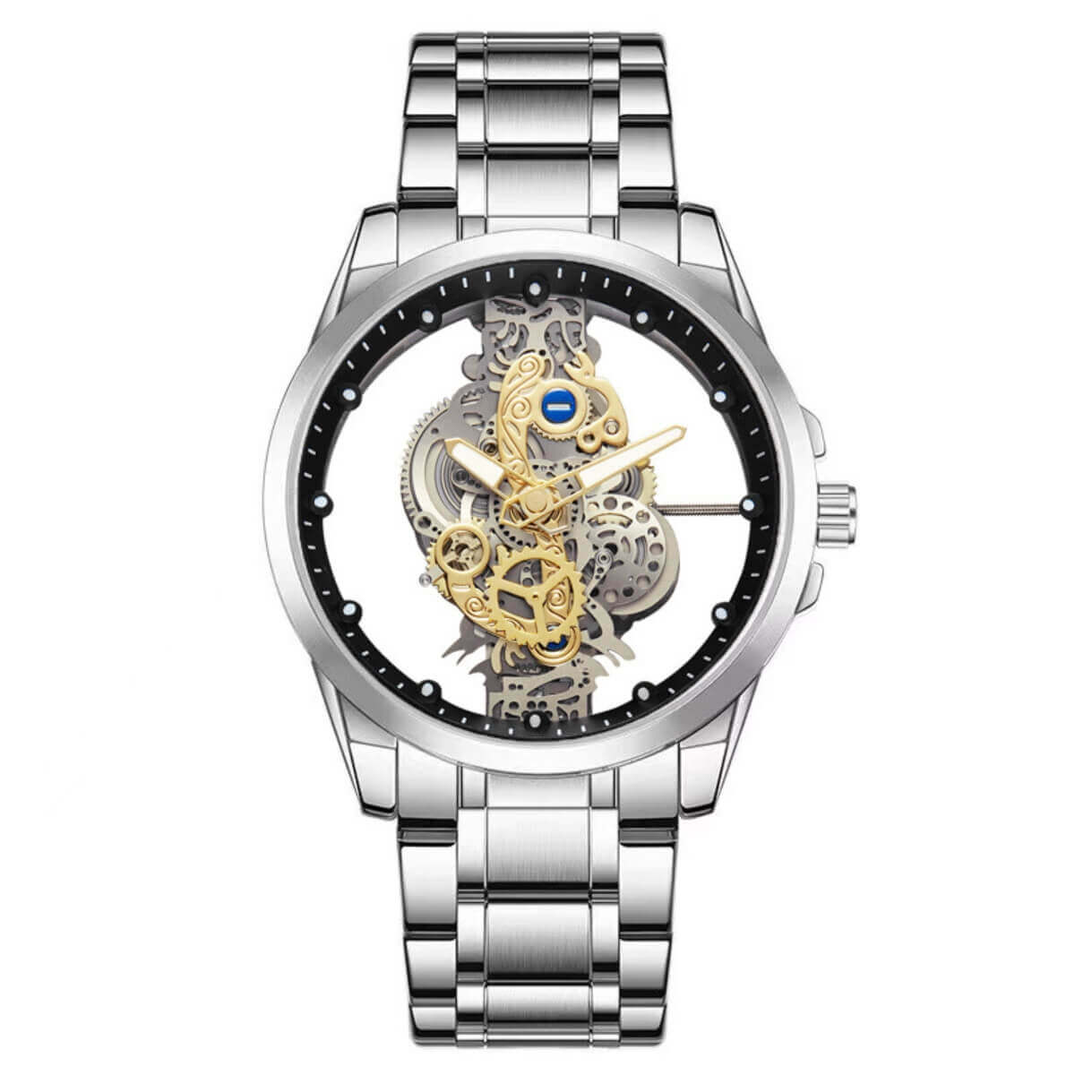 The Barrett | Hollow Mechanical Skeleton Wristwatch | 40mm blends traditional watchmaking detail with contemporary design. Its openwork dial reveals the intricate inner mechanics, offering a view of precision in motion. Accented with a two-tone stainless steel finish in gold and silver, it combines durability with a refined visual appeal suitable for everyday wear.