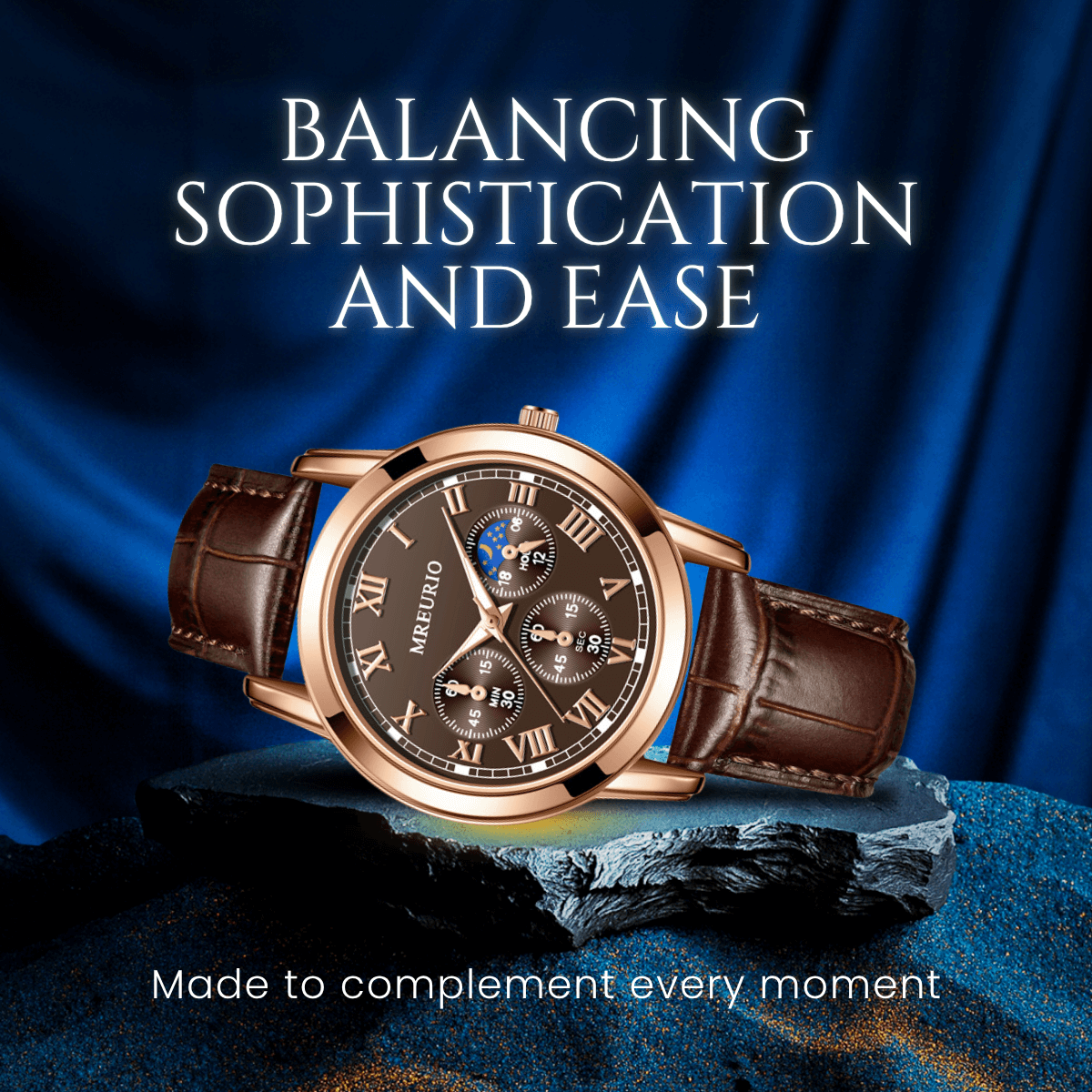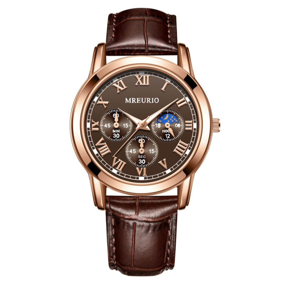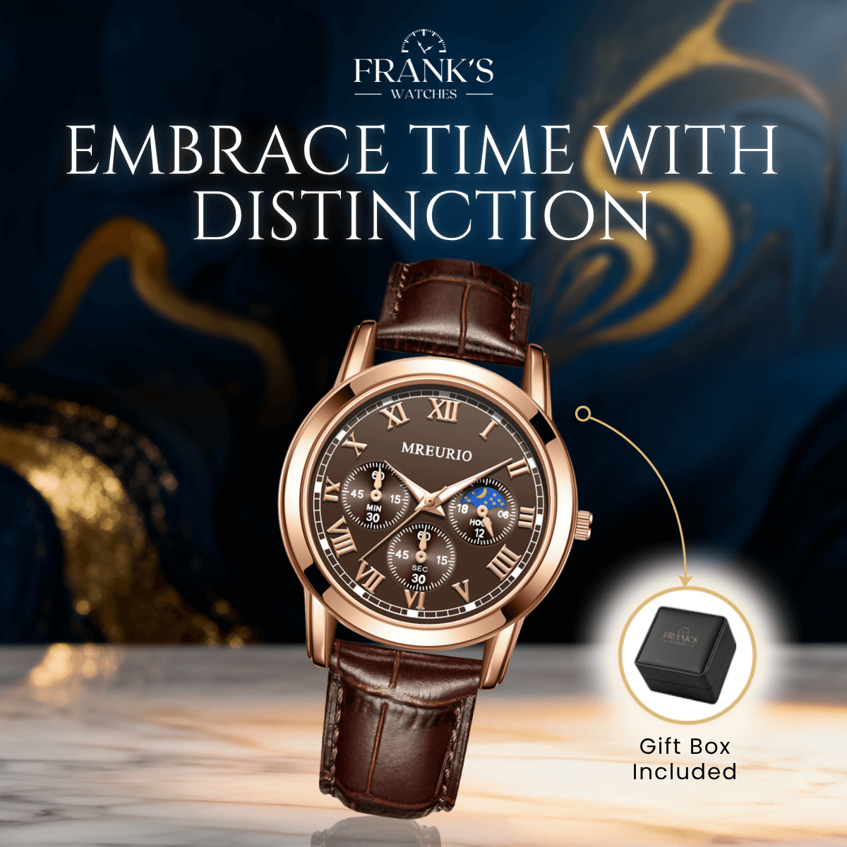 The Caldwell | Men’s Elegant Business Quartz Watch | 40mm is crafted for those who appreciate refined simplicity and everyday function. With its rose coffee finish and textured brown dial, it presents a balanced blend of sophistication and practicality. The moon phase chronograph display adds subtle detail while the quartz movement ensures accuracy day after day.