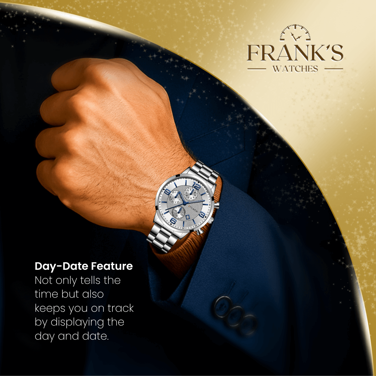 The Harlan | Men’s Stainless Steel Chronograph Quartz Watch | 42mm blends precise engineering with refined style. Its metal case and bracelet are paired with a textured dial accented by bold blue numerals and markers, creating a confident yet versatile look. The chronograph layout and luminous display ensure practicality without compromising on clean design.
