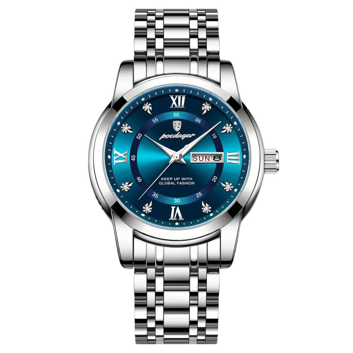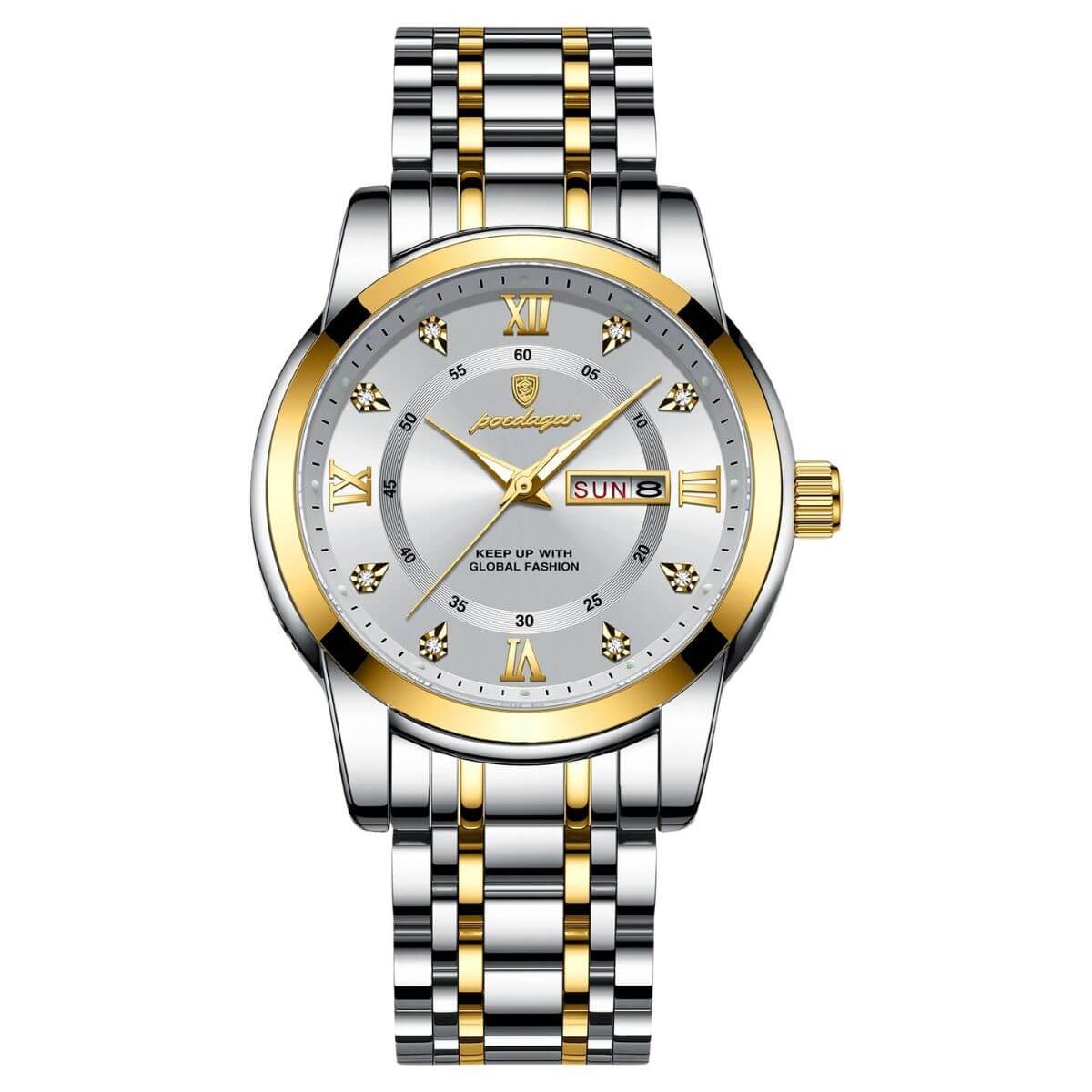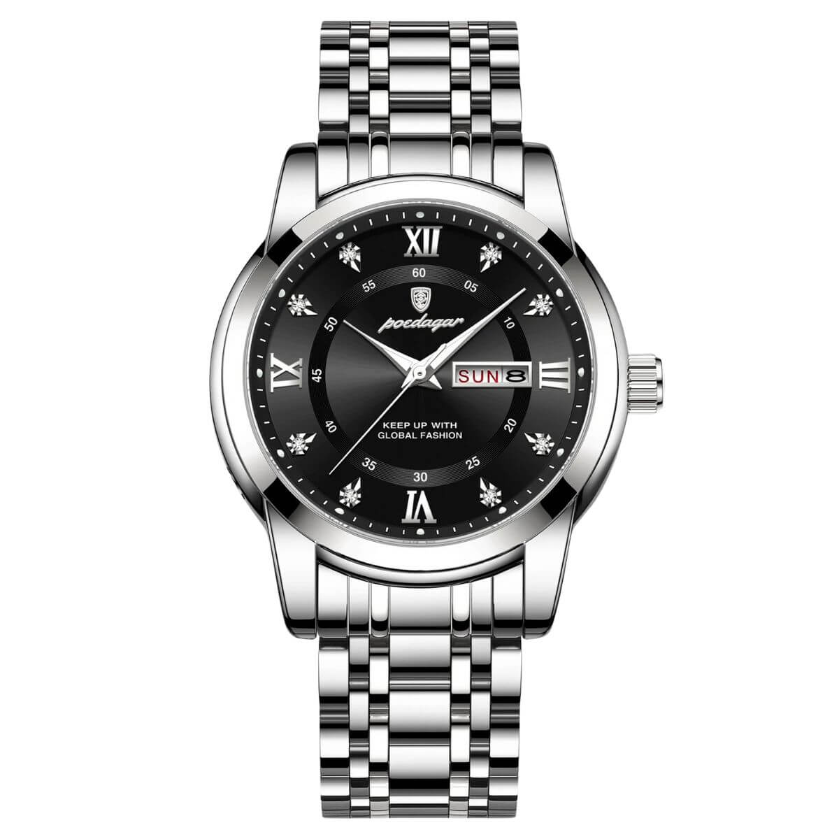 The Magnus | Prestige Stainless Steel Calendar Watch | 41mm combines timeless design with everyday practicality. Its elegant craftsmanship is defined by polished detailing and a precise quartz movement that ensures dependable performance. The bold dial layout with Roman numerals and date-day indicators balances sophistication and utility, making it an ideal companion for any man with a taste for refinement.