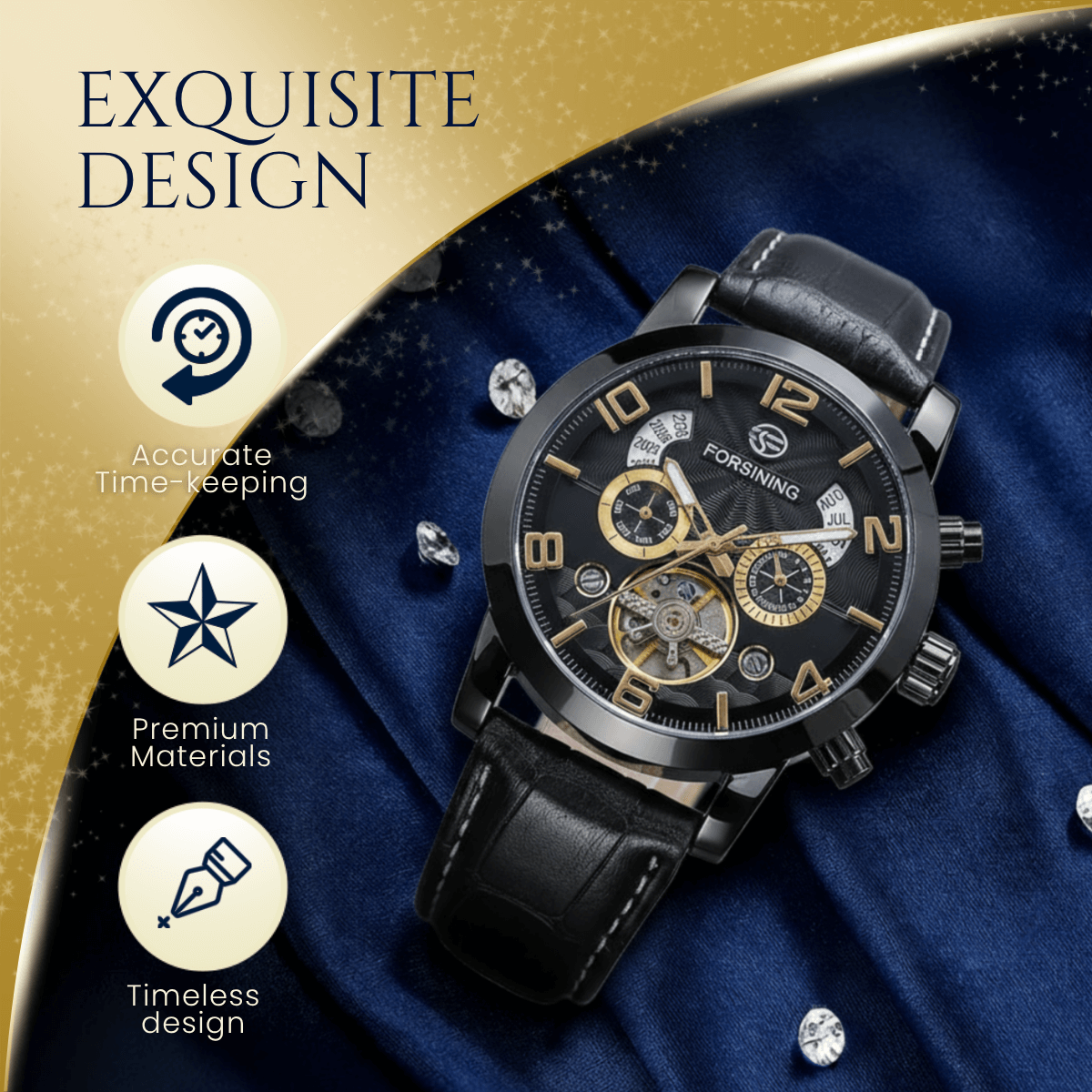 The Merrick | Classic Open Balance Wheel Wristwatch | 46mm combines craftsmanship with striking design. Featuring an exposed balance wheel at its center, the timepiece gives a glimpse of its mechanical rhythm while maintaining a sleek and balanced aesthetic. The black and gold color pairing enhances its sophisticated look, complemented by a genuine leather strap that delivers comfort and durability.