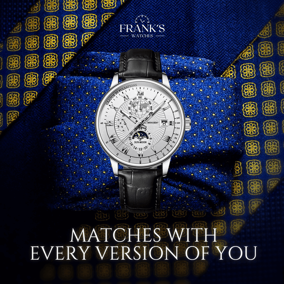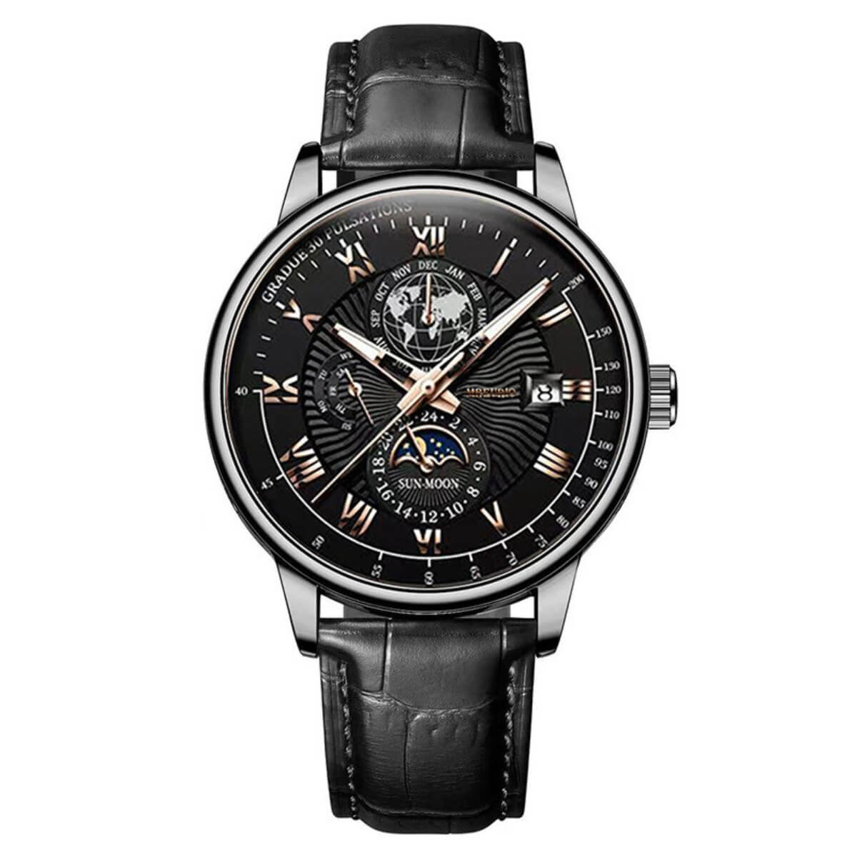 The Radford | Classic Perpetual Calendar Automatic Watch | 39mm combines intelligent design with a timeless aesthetic. Its black dial features layered calendar indicators, including a sun and moon display and date window, creating a sophisticated yet highly functional layout. The polished silver-tone case and black leather strap bring a professional finish that balances modern appeal with traditional craftsmanship.