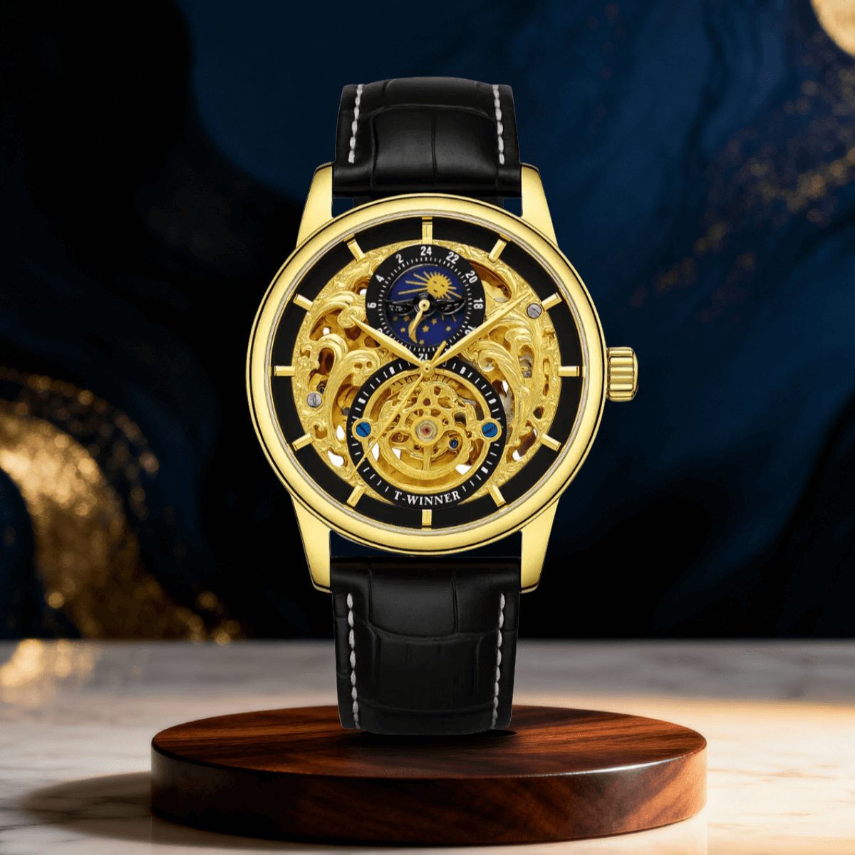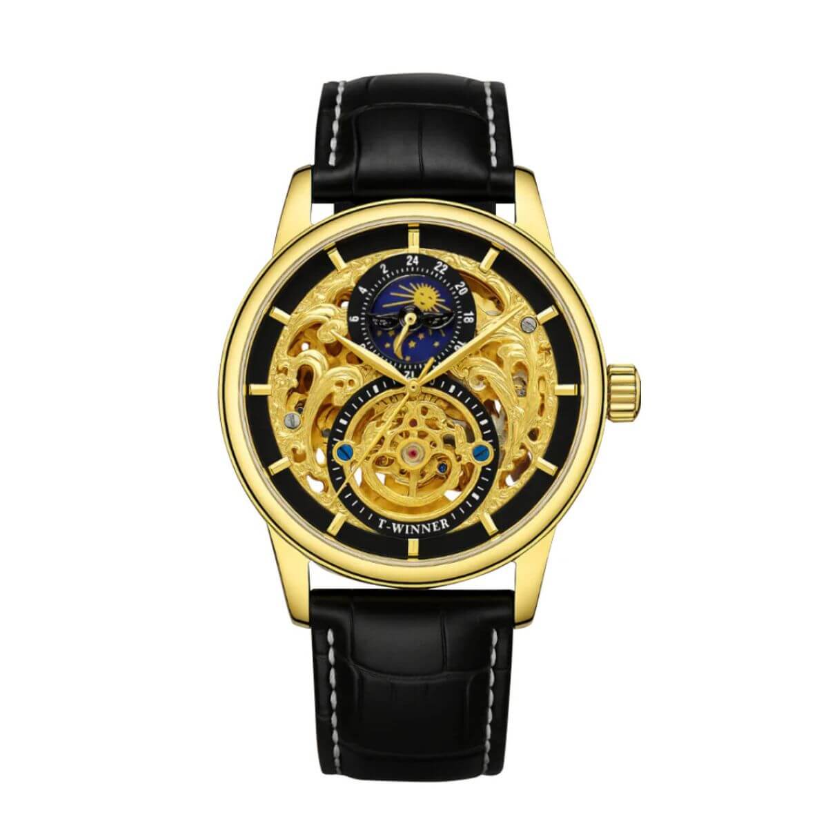 The Winsley | Men’s Dual Skeleton Mechanical Watch | 44mm blends craftsmanship and performance in a bold, openwork design. Its double-hollow dial exposes the intricate mechanical movement within, offering a glimpse of the precision that drives it. The detailed structure, matched with a genuine leather strap and folding clasp, delivers both sophistication and everyday reliability.