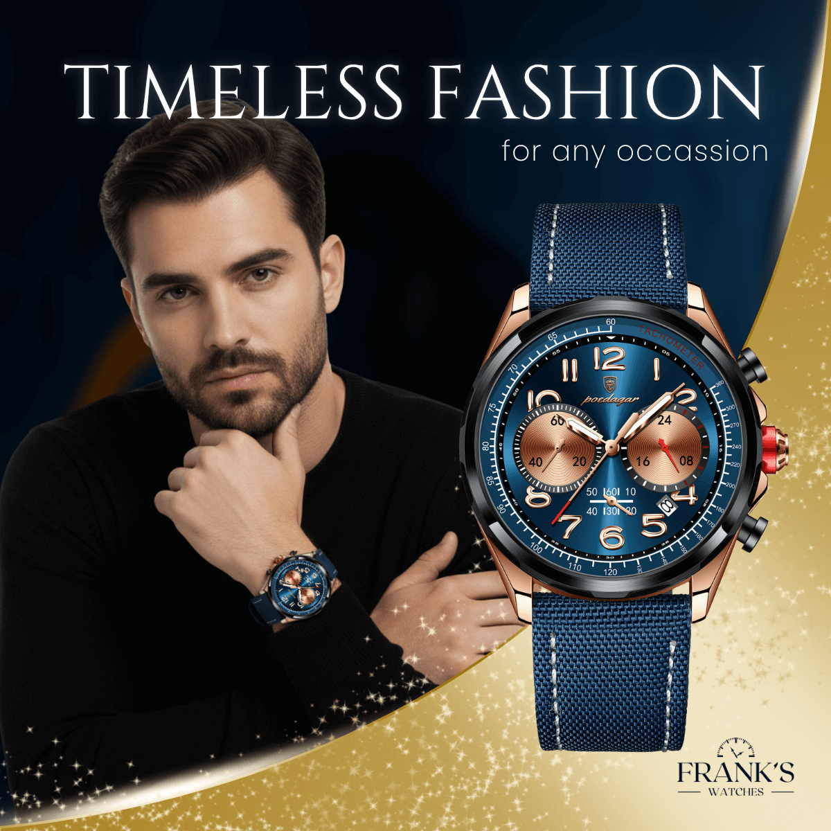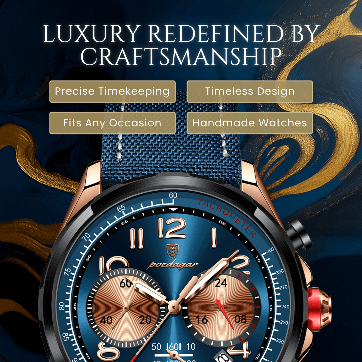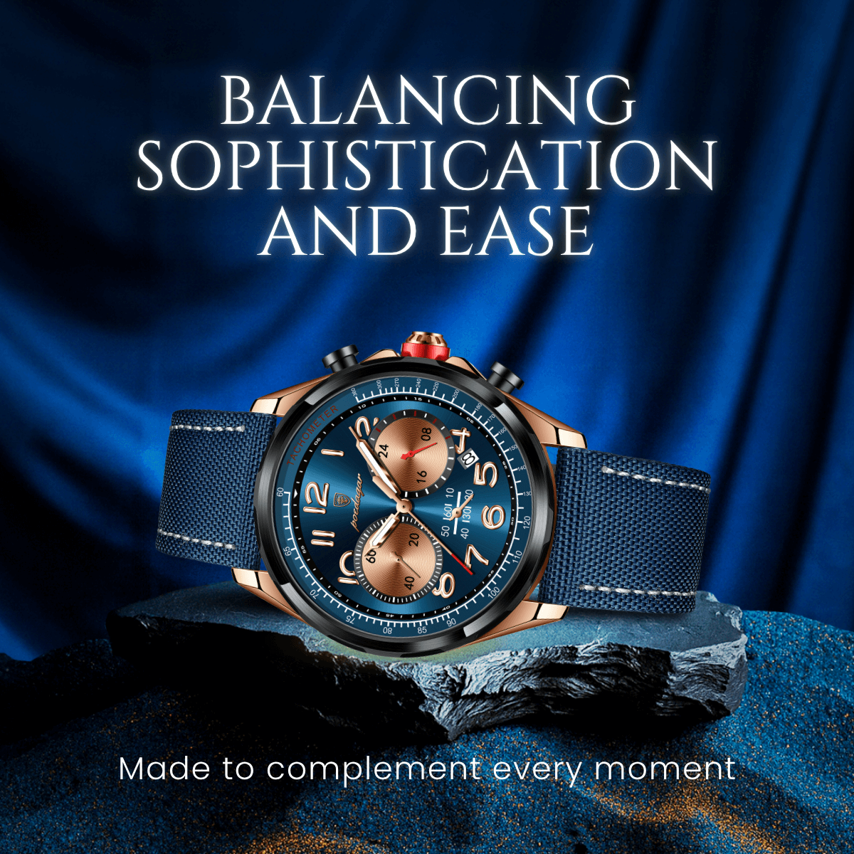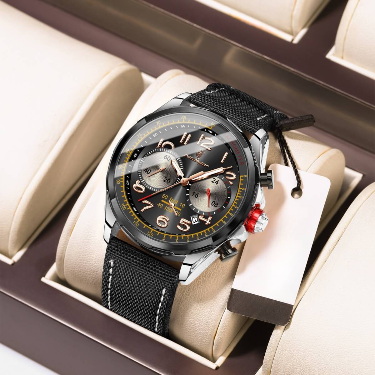 The Jenson | Precision Chronograph Quartz Wristwatch | 41mm combines performance and modern craftsmanship. Its tachymeter bezel and dual subdials provide accurate tracking, while the luminous hands and bold hour markers ensure easy readability. The design brings together polished alloy, durable glass, and a canvas strap for comfort and reliability.