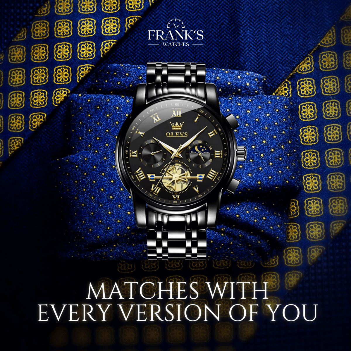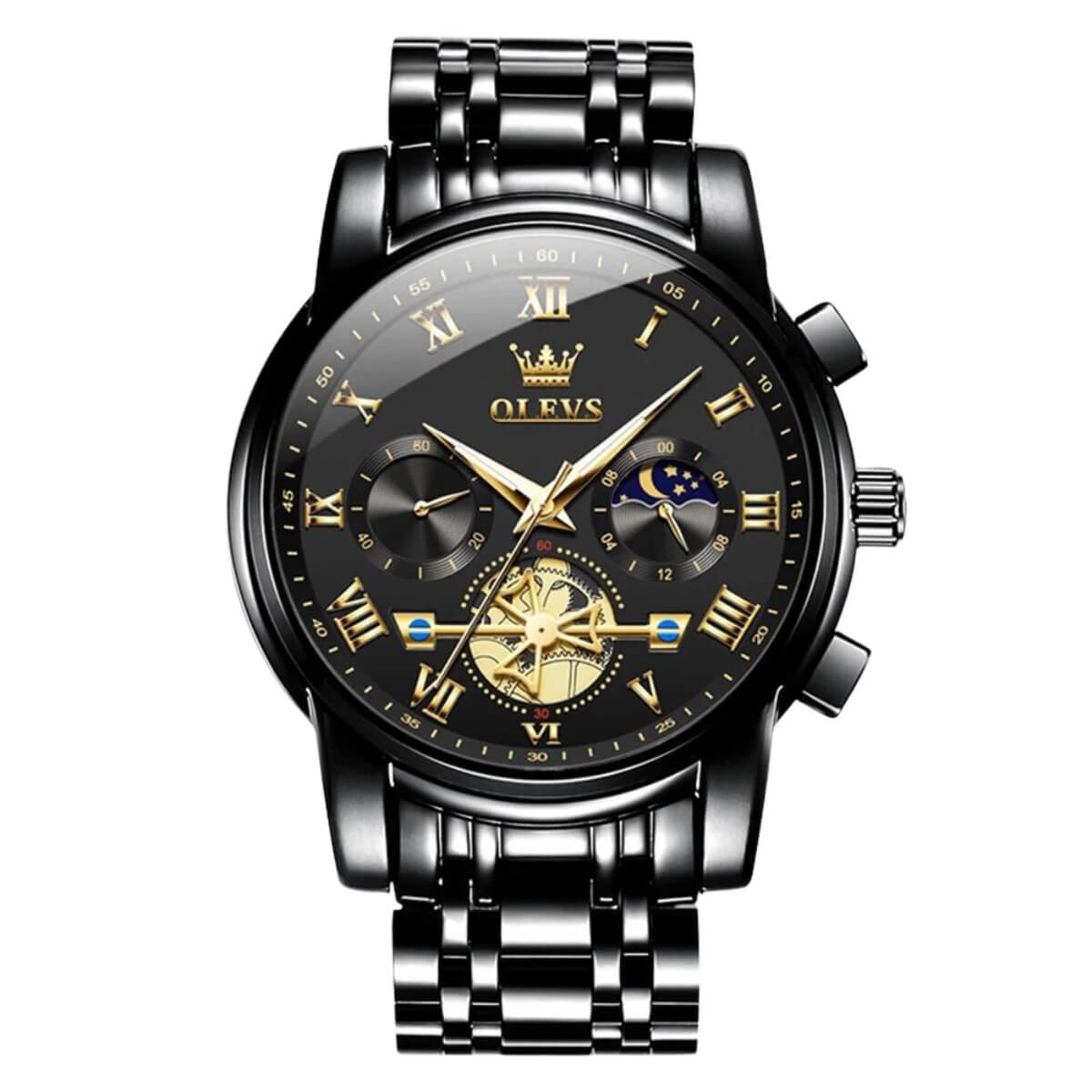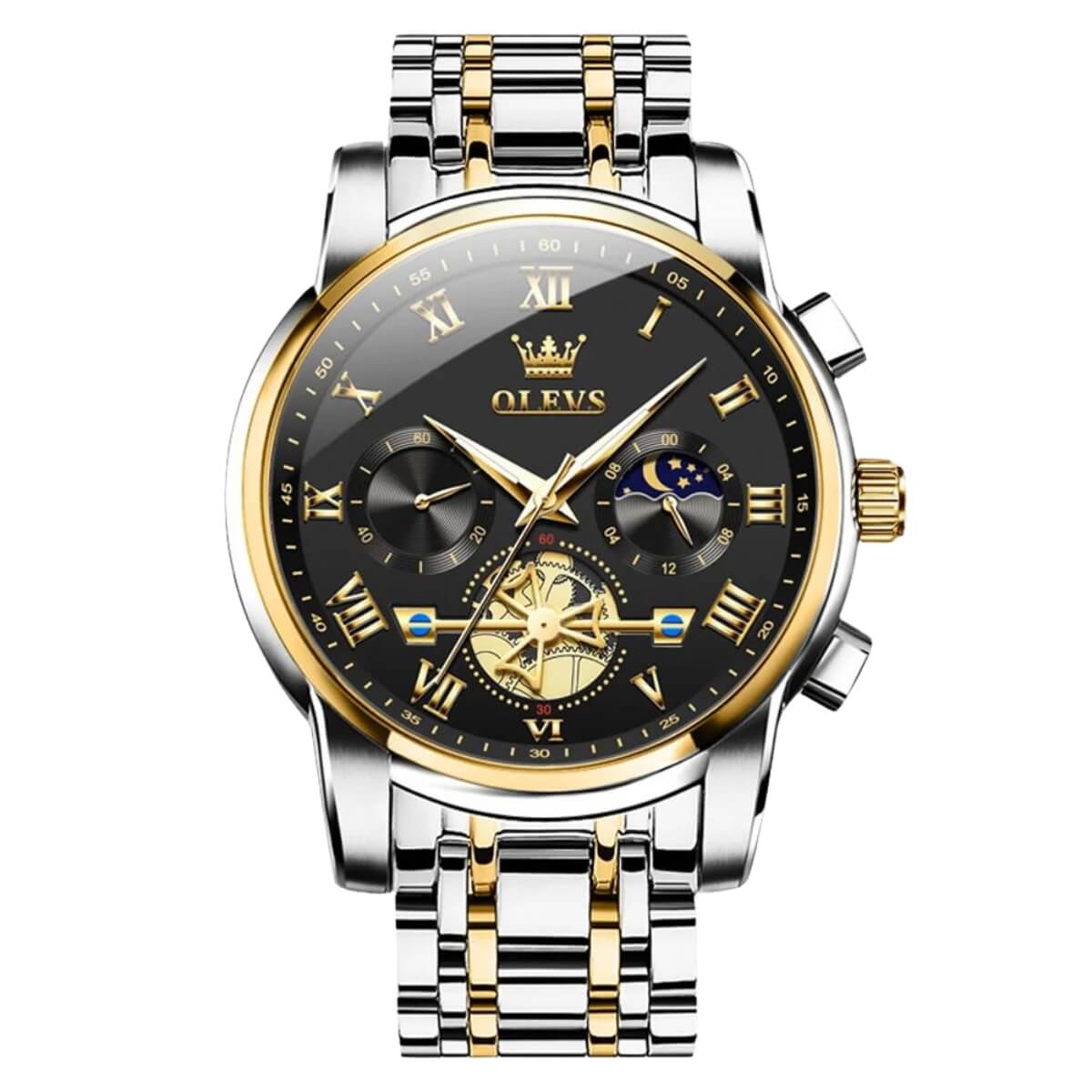 The Henley | Classic Business Mechanical Watch | 41mm combines refined mechanical engineering with timeless design. Featuring Roman numeral indices, visible gears, and a moon phase sub-dial, it delivers both form and function in one striking timepiece. Its stainless steel construction ensures durability, while the coated glass provides clarity and resilience for daily wear.