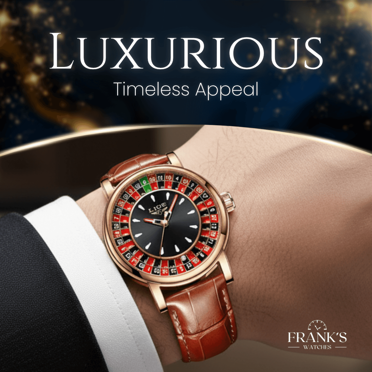 The Durant | Men's Roulette-Inspired Quartz Wristwatch | 45mm blends craftsmanship and creativity in a bold, eye-catching form. Designed with a roulette-style dial pattern and luminous accents, it stands out as a statement piece for those who appreciate distinctive style. Its sleek alloy case, combined with a comfortable imitation leather strap, offers a refined finish suited for everyday or formal use.