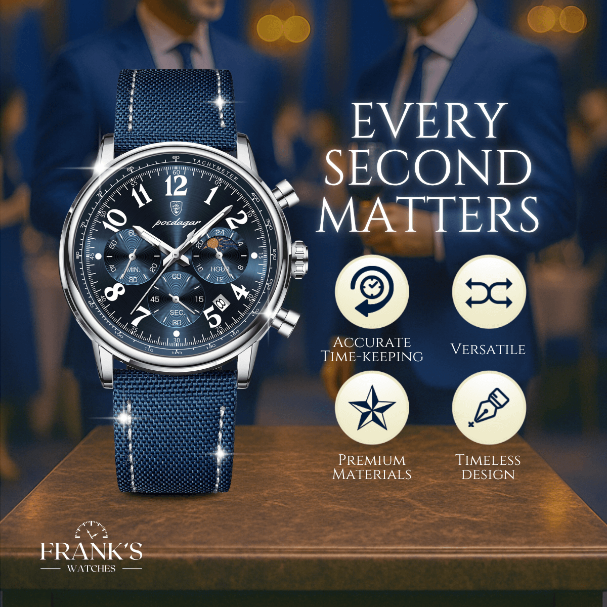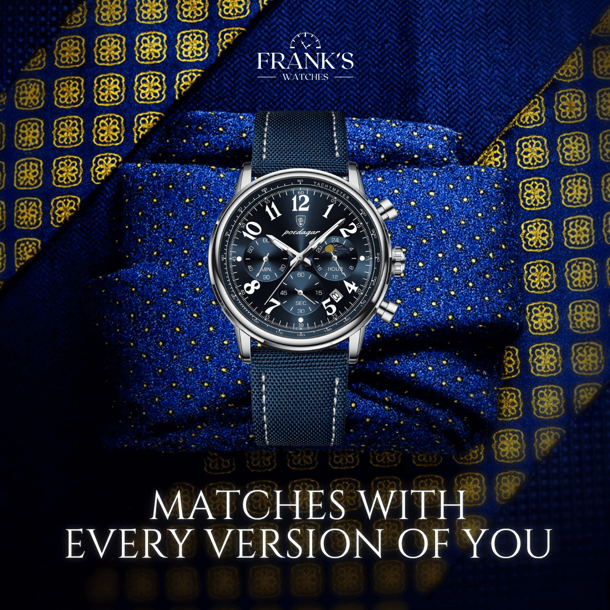 The Eddington Moon Phase Chronograph Quartz Watch 40.5mm blends craftsmanship and function into a versatile timepiece. Its detailed dial features chronograph subdials and a moon phase indicator, harmonizing performance and refined aesthetics. The stainless alloy case and textured canvas strap combine durability with comfort for daily wear.