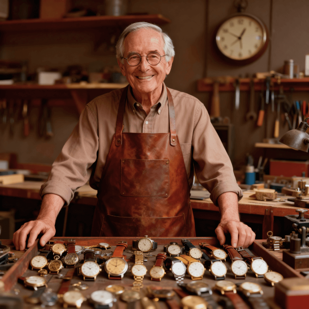 Hi there, I’m Frank, and I’m truly grateful you’ve found your way here. For over 45 years, I’ve been at my workbench, carefully bringing watches to life with patience and care. Each one I’ve touched carries more than just time, it carries memories, stories, and a piece of who I am.