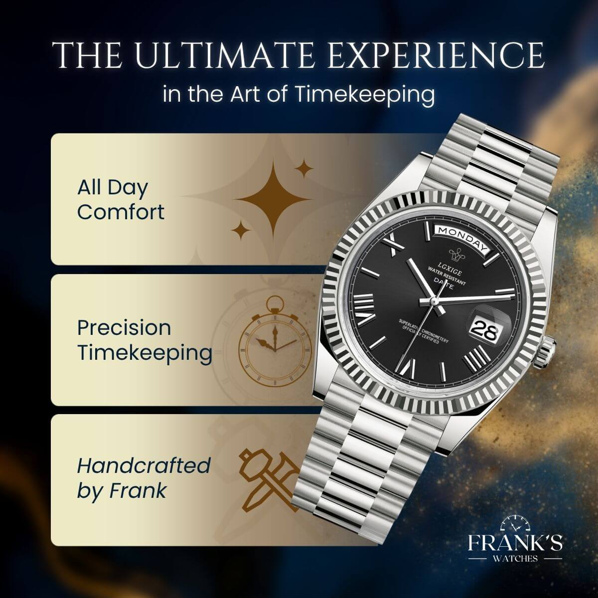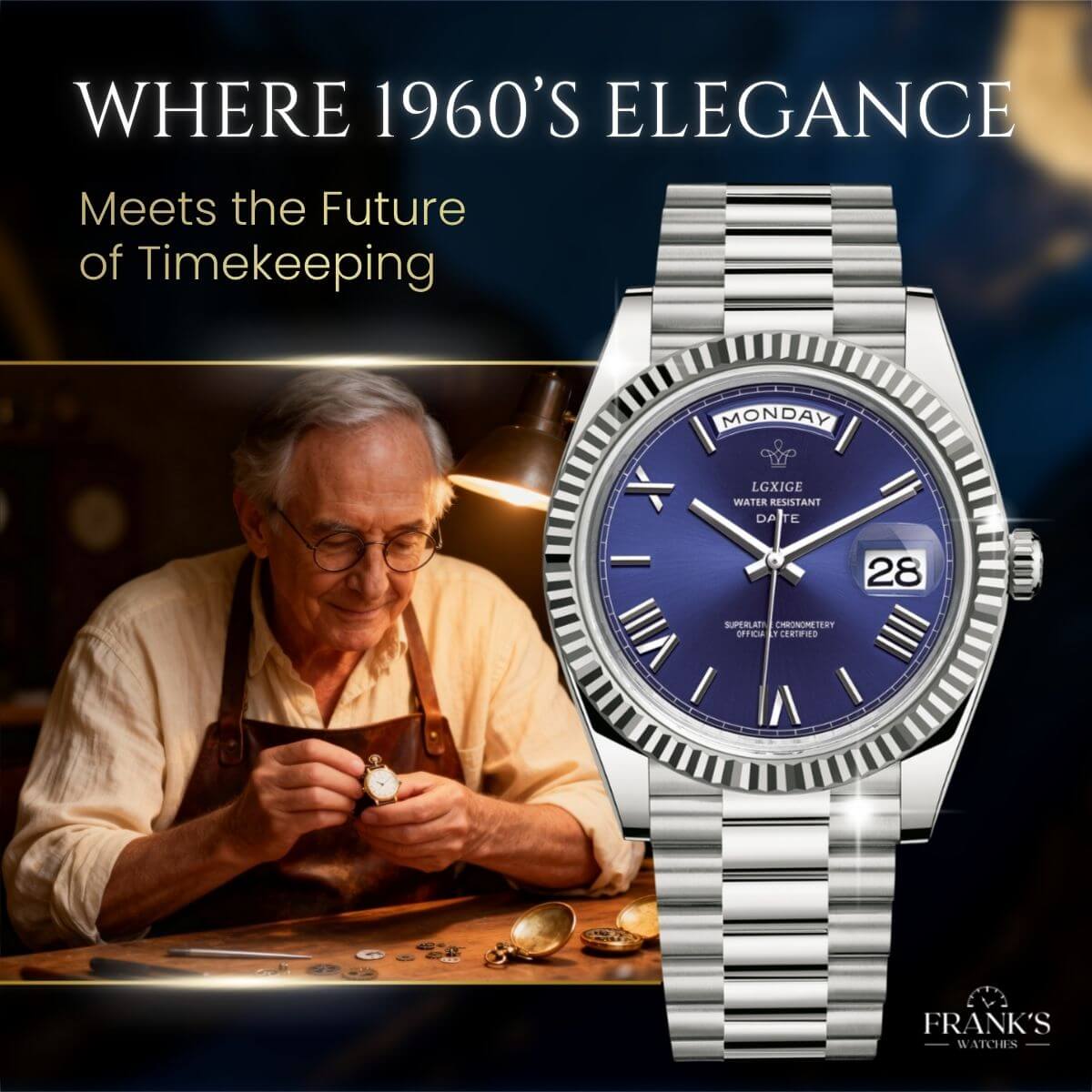 My name is Frank, and for more than 45 years I have been making watches by hand in my small boutique. This craft has been my life’s work, and every watch I build carries a piece of my heart.