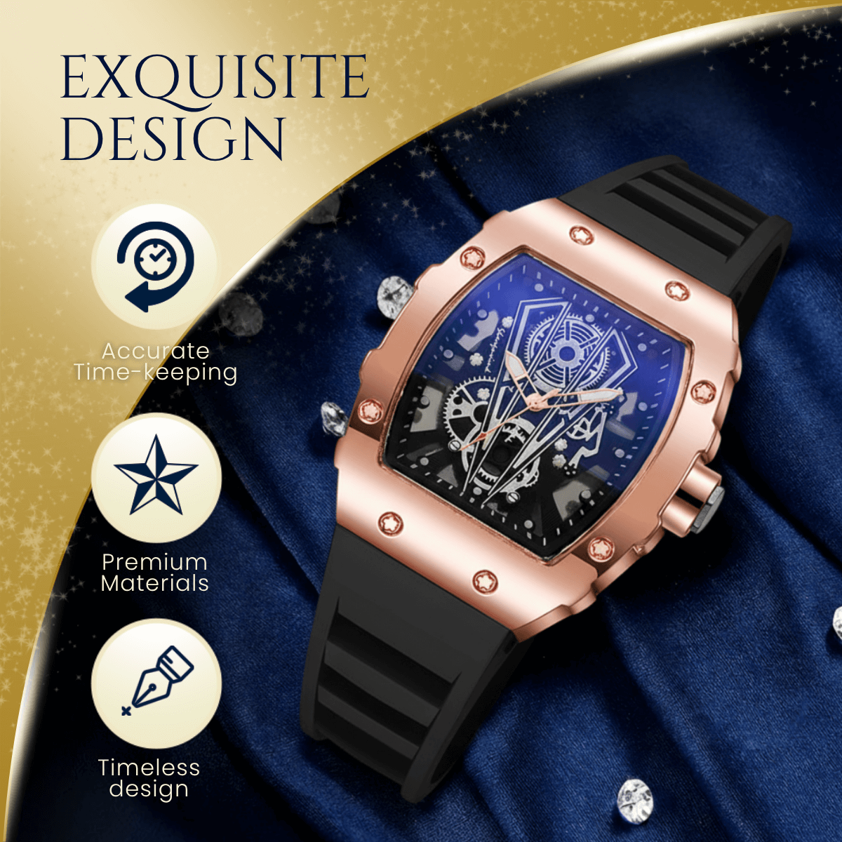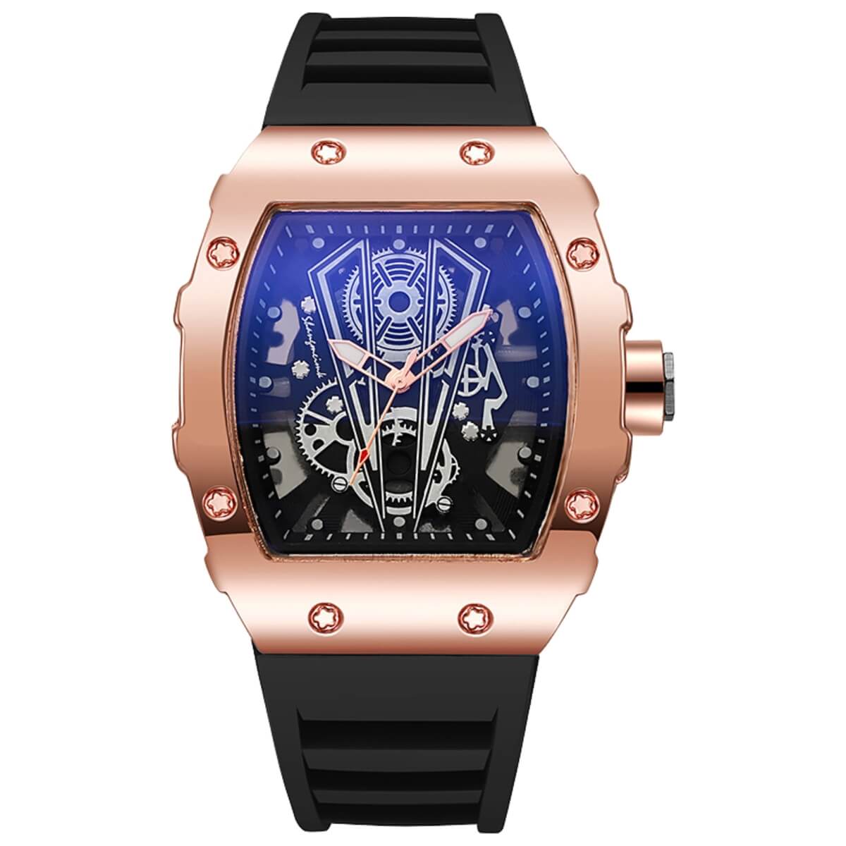 Perfect for those who appreciate mechanical artistry in a modern form, the Garrick complements any occasion casual or formal. The comfortable silicone strap ensures ease during long wear, while the alloy case and flat-top conical crown add a refined industrial touch. It’s a piece that blends the boldness of design with the practicality of daily use.