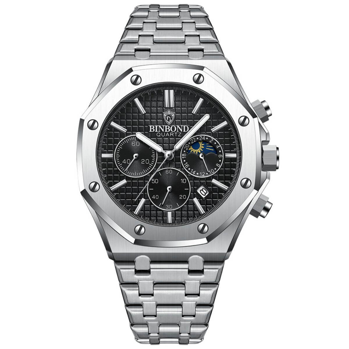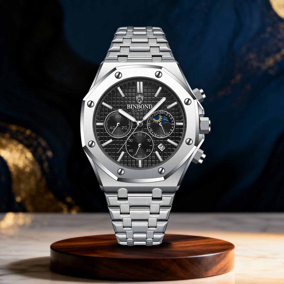 The Halston | Octagonal Multifunction Moon Phase Wristwatch | 42mm showcases refined engineering in an octagonal silhouette that balances modern appeal with classic durability. Designed with a robust steel case and a patterned dial, it delivers a commanding presence complemented by chronograph functionality and a subtle moon phase indicator. It’s a watch that reflects focus, sophistication, and practical craftsmanship.