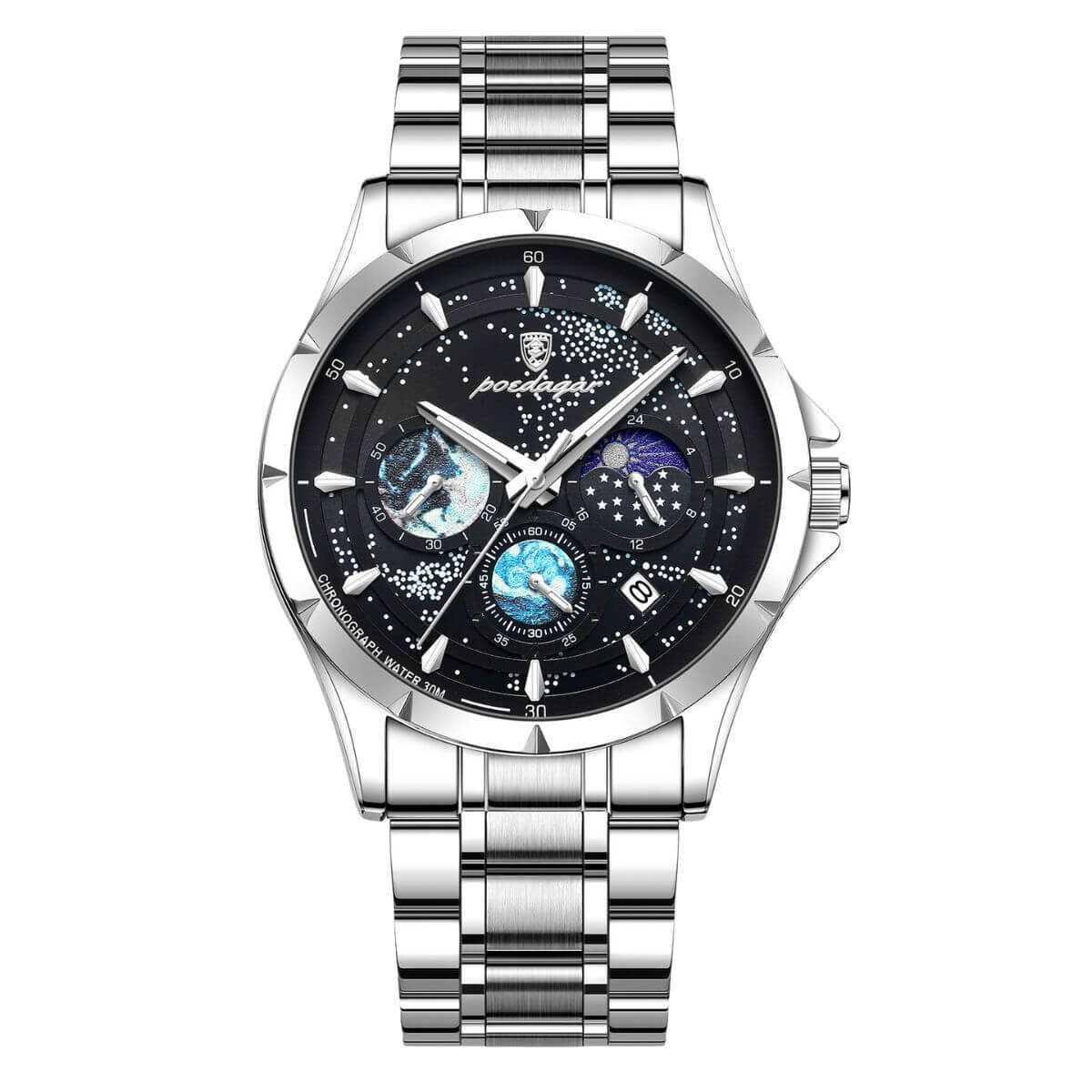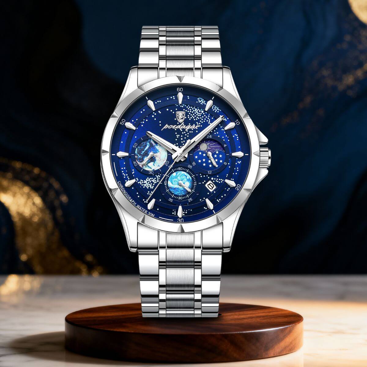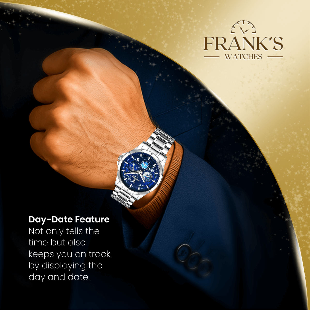 The Troy | Men’s Moon Phase Multifunction Quartz Watch | 42mm presents a balance of elegance and technical precision. Its intricately detailed dial, inspired by celestial patterns, features moon phase and chronograph displays that merge function with artistry. A solid stainless steel band adds both strength and sophistication to the overall design, making this watch a statement piece for those who value precision and aesthetic harmony.