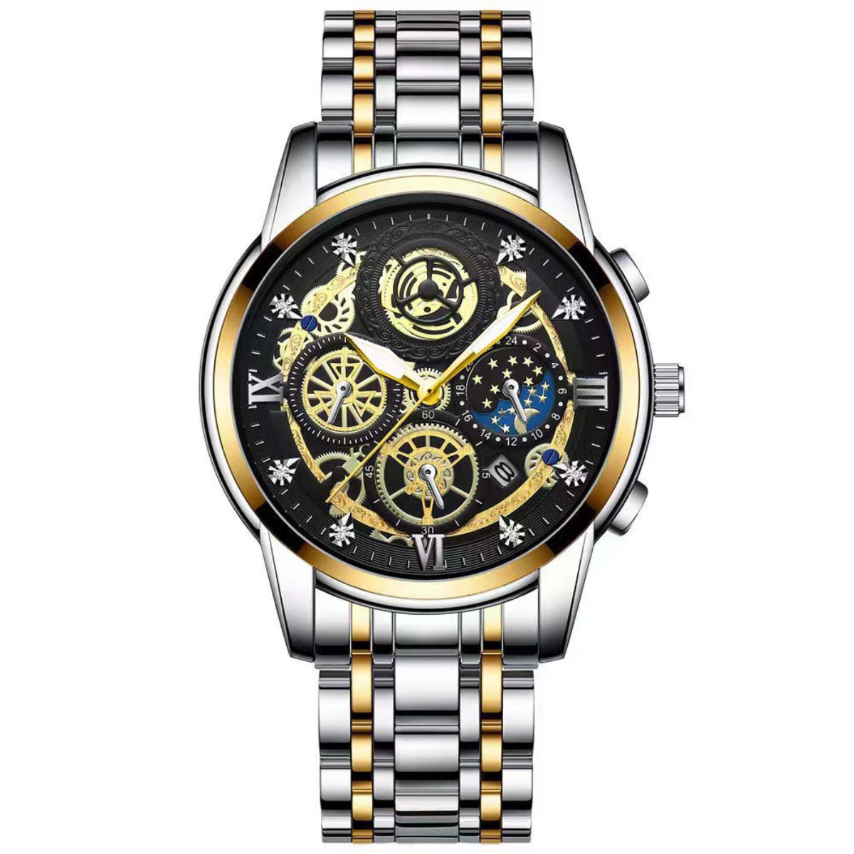 The Truman | Men’s Skeleton Gear Chronograph Quartz Watch | 42mm showcases a bold design inspired by intricate mechanical movements. Its skeleton-style dial reveals detailed golden gears and layered elements, giving the watch a unique and technical character. Combining artistic engineering with practical function, this piece is built for those who value design that stands out and performs reliably.